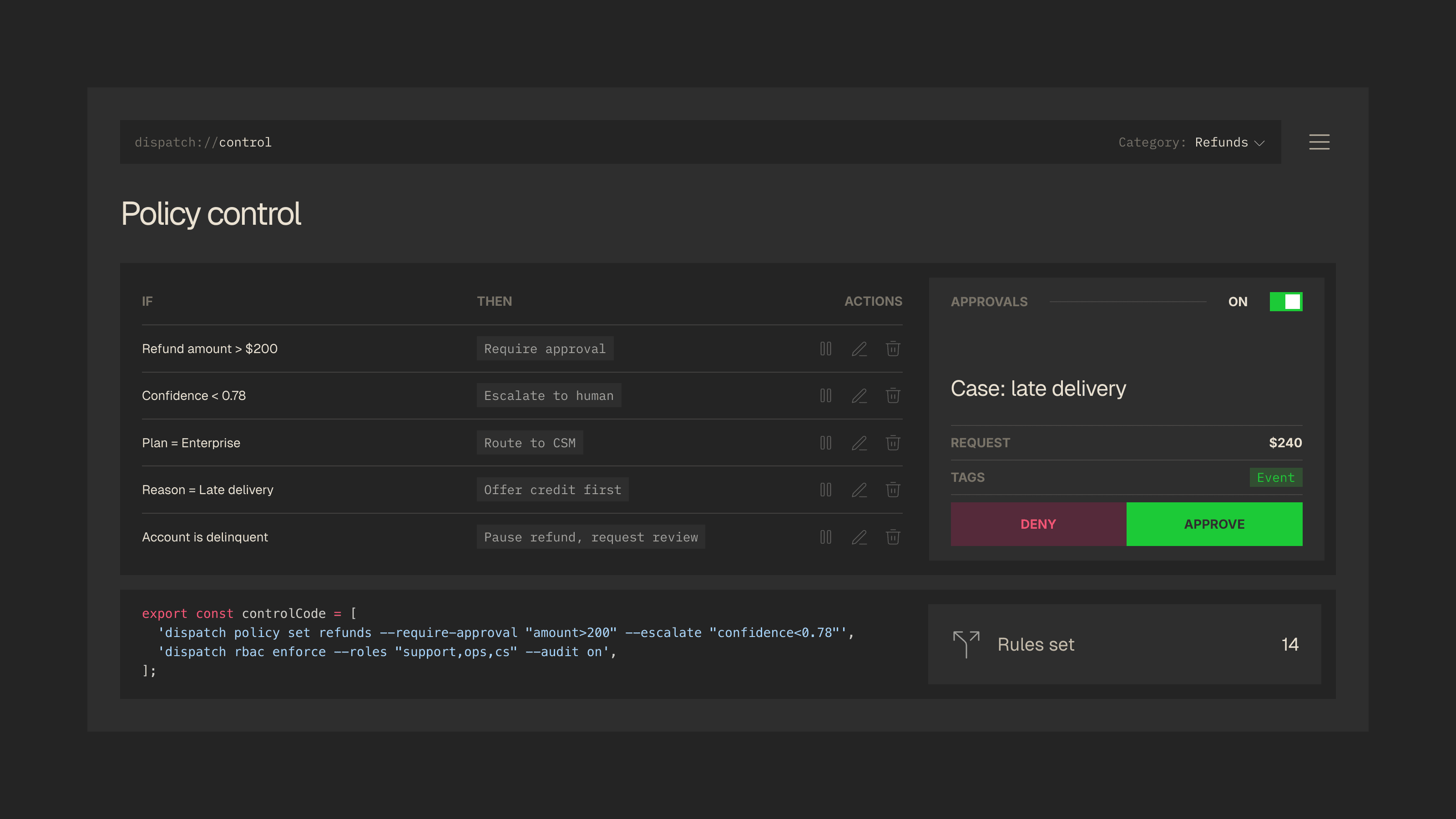 Absolutely. You set the guardrails — define which actions require approval, which can auto-execute, and which stay manual. Dispatch follows your policies, not its own.