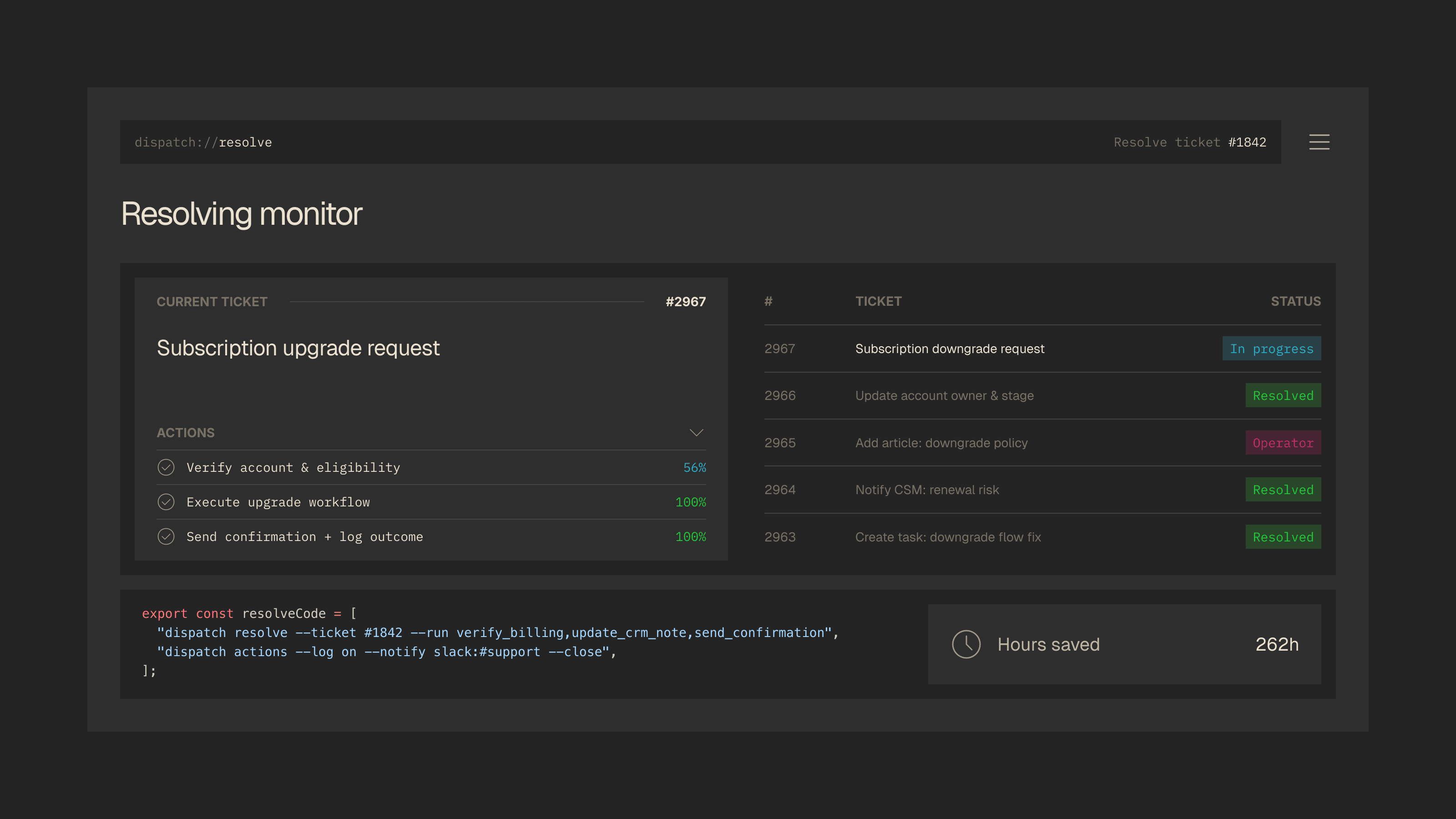 Dispatch is an AI operations layer for support teams. It connects your helpdesk, knowledge base, and CRM to resolve tickets, run approved workflows, and keep records accurate — automatically, with full visibility and control.